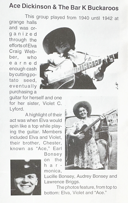 Way back in the early 1940’s, she and some of her wild siblings and friends formed a locally popular country-western band that played at the area Grange halls. According to a 1999 article in Paper Talks: as dirt-poor as they were, Ma’s (Violet’s) older sister Elva earned enough cash by “cutting potato seed” to purchase a guitar for herself and one for her. They named themselves The Bar-K Buckaroos. Mom’s brother Chester, a born con man, acted as the band’s “manager” under the imaginative name Ace Dixon.