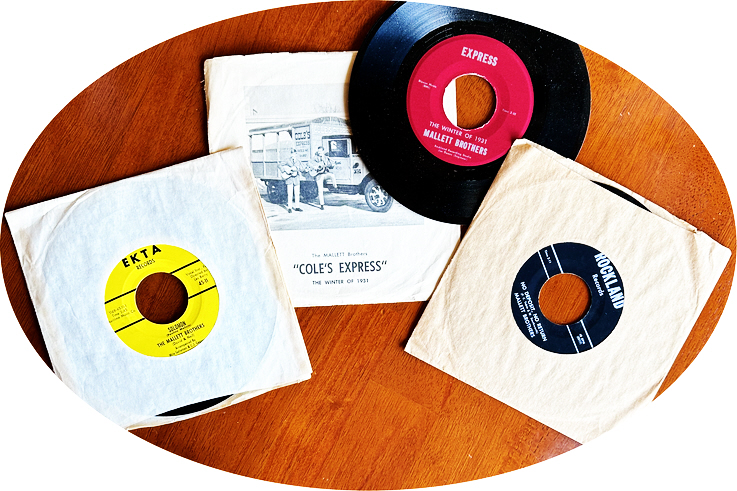 The 45 in the center is titled “Cole’s Express.” The story behind that one is that The Mallett Brothers got hired by a large firm in the small city of Bangor, ME, namely Cole’s Express. They were hired to sing their way north to south, east to west all over the state of Maine to promote Mr. Cole’s company. It was a lucrative deal.