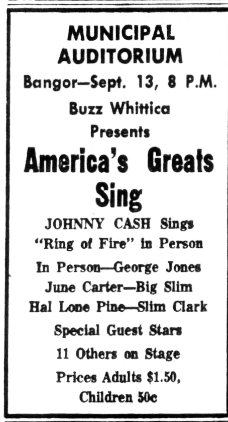There were a lot of other locals lined up to play before The Man in Black. They started off with a yokel named (wait for it) Yodeling Slim Clark (A.K.A., “Maine’s Great Yodeler”). Three guesses as to what he mostly did. And there were other locals too. Hal Lone Pine. (Sure. Somehow I too tend to doubt that that was Hal’s actual last name.) Big Slim? What? Two Slims on the same card? Terri Lynn? Jeanne Ward? I didn’t know them, nor do I remember their performances at all. It was getting to be a long night.