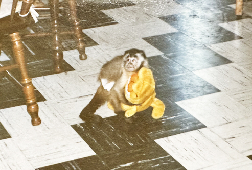 Mercifully, I was rescued by one of the staff ladies who leapt out of her chair, stopped me mid-spin, and carefully began extricating the four little limbs and long tail of what turned out to be an eight-month-old, baby Capuchin monkey! What the hell was a monkey doing at the Y?