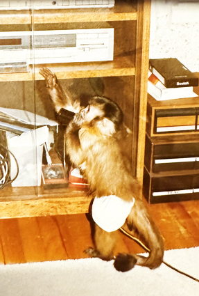 Sandy had instructed us to wait about fifteen minutes or so before releasing him from his little “apartment,” to give him a some time to begin to get used to his new circumstances. A period of adjustment. Then, we could let him play with us to his and our hearts’ delight, which I could barely wait for. Then, when the Cinderella hour (or whenever it was we wanted to go to bed) finally rolled around, we could put him back in for the night. He’d been thoroughly trained to obey the simple command, “Cage,” she told us. “Say that just once and he’ll scamper his little self right back into it for the night,” she said. It was such a relief and blessing to us to have been given a magic word like that, as I was still feeling almost like we had a real human baby in the house again, and without the assurance of a Dr. Spock monkey manual.