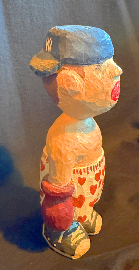 This objet d’art (ha ha) commemorates a sad little childhood memory. Me, approximately age five, I’m guessing. My cousins, four or five years older than me. Meanies. Bullies. They owned two sets of boxing gloves. Too large for me, but they didn’t care. They’d just poke my hands down into them and cinch them on my wrists with twine.